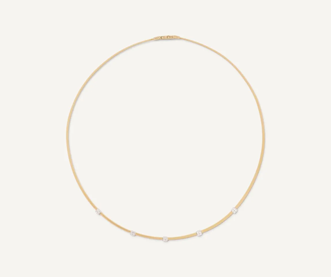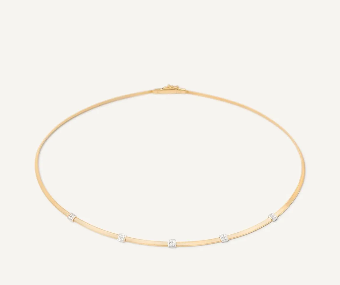 A Lightweight And Slender Timeless Classic, This 18Kt Yellow Gold Flat-Coil Necklace Is Embellished By Five Small Brilliant-Cut Diamond Pave Elements.